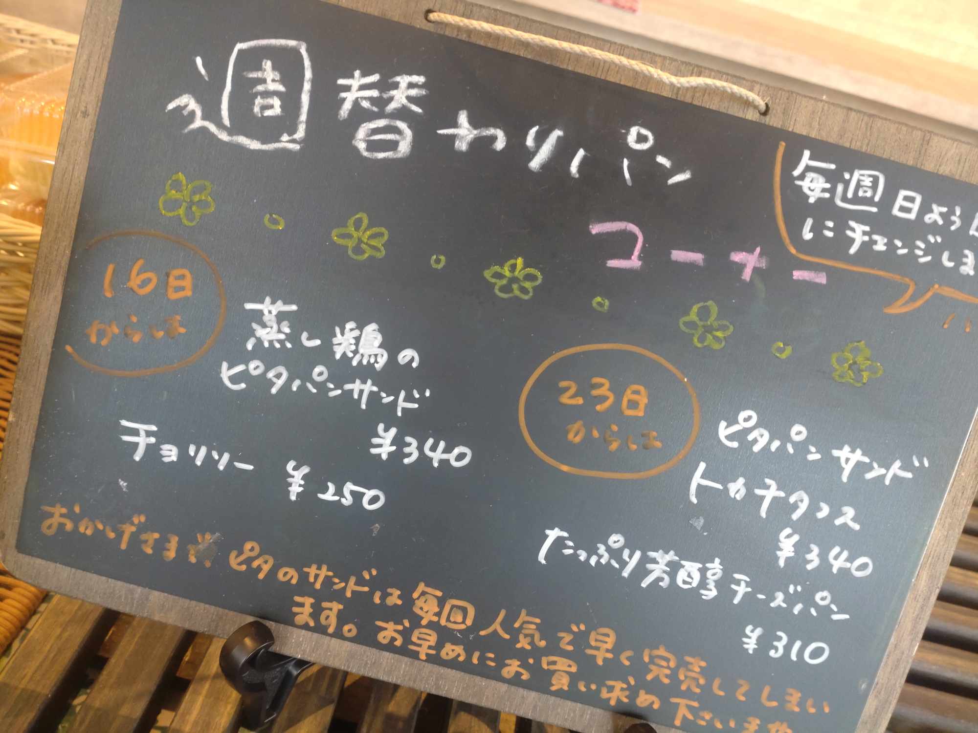 6月16日(日)~22日(土)の週替わりパンは、フランスパン生地でピリ辛ジューシーチョリソーを包んだ「チョリソー(250円)」&新鮮野菜と柔らかく蒸しあげたチキンをサンドした「ピタパンサンド蒸し鶏(340円)」が登場します。こちらもお楽しみに~♡