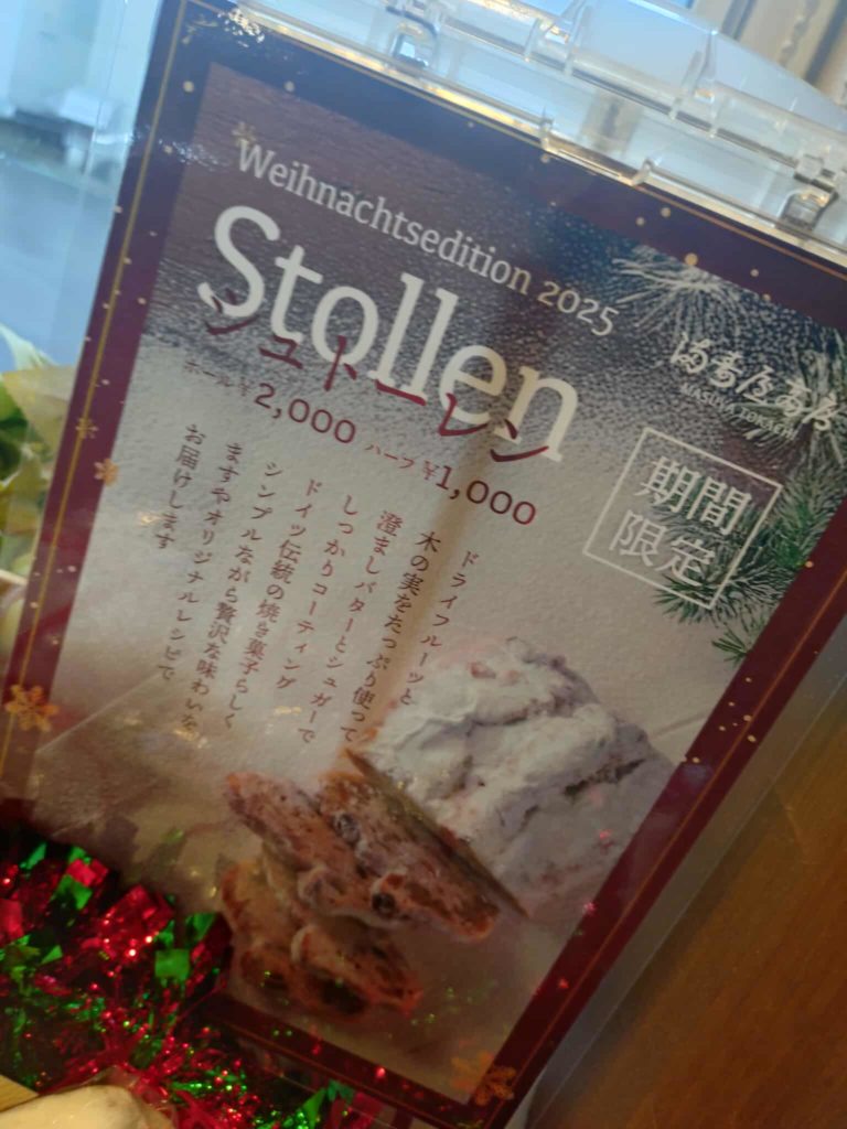 そして、クリスマスといえば・・・シュトーレン!めむろ窯では「ますやシュトーレン(ハーフ1000円・1本2000円)」を期間限定で販売しています