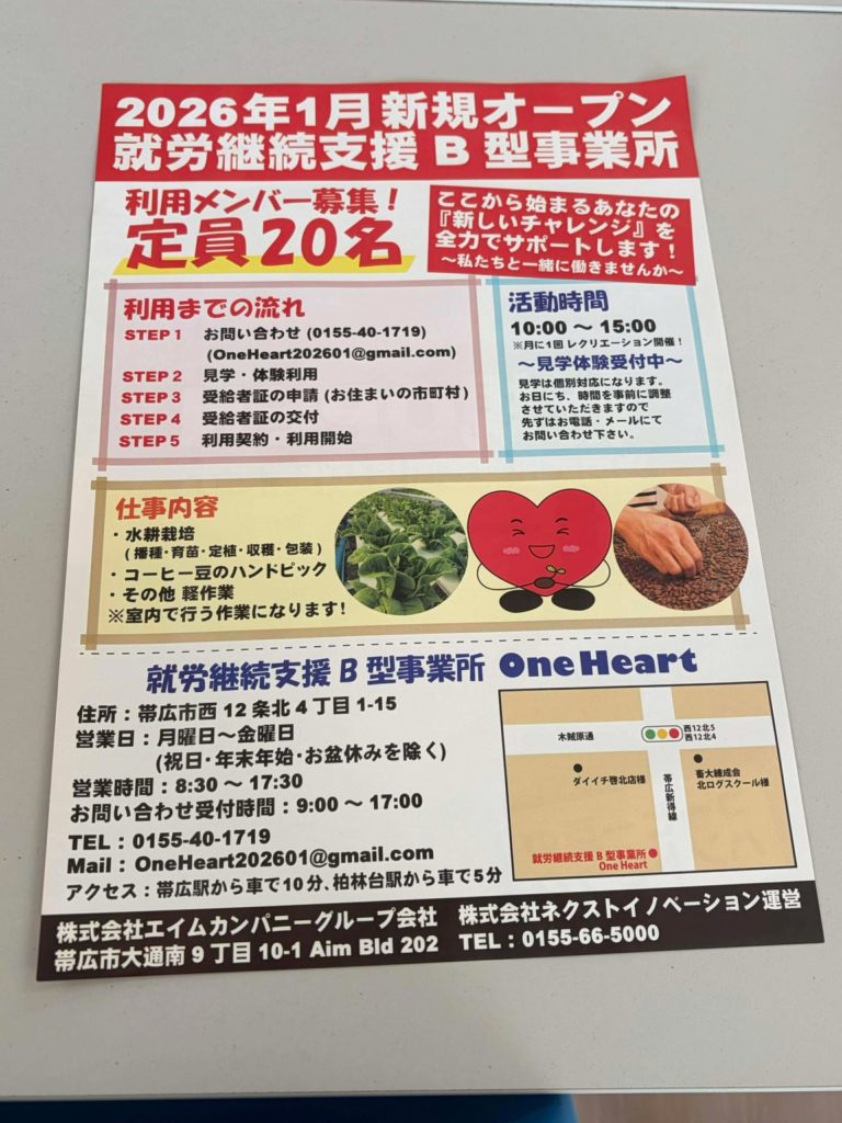 帯広市西12条北4丁目1-15にある「就労継続支援B型事業所 One Heart」から!