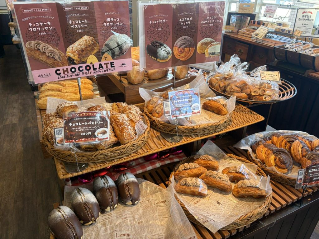 「チョコケーキクロワッサン(350円)」「チョコレートペストリー(280円)」「板チョコクロワッサン(300円)」「チョコパウダー(200円)」「エスカルゴショコラ(250円)」「ショコラ シュー・デニッシュ(210円)」とありますので、期間中に全商品制覇しちゃいましょ